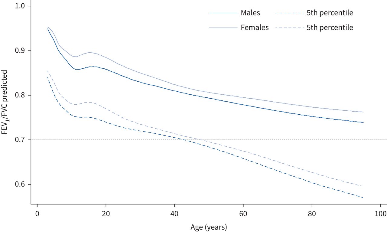 The GOLD committee recommends FEV1/FVC < 0.7 (after bronchodilation) as cut-off value for airway obstruction. FEV1/FVC ratio declines with increasing age and height, even in healthy lifelong non-smokers, in whom the LLN drops below a ratio of 0.7 after about 45 years of age. Thus the use of fixed ratio to diagnose airway obstruction is imprecise and causes over-diagnosis in elderly and under-diagnosis in younger patients (as seen in the figure below). Therefore FEV1/FVC<5th percentile (LLN) should be used to define obstruction on spirometry.